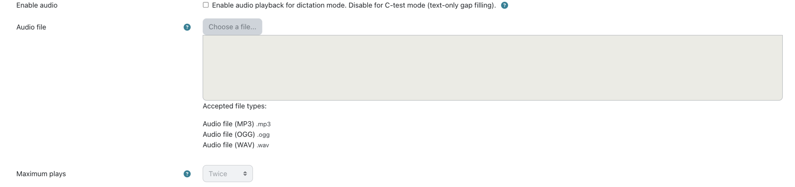 No special configuration is required. The plugin works out of the box. However, you may want to check your Moodle file upload limits if you plan to use large audio files..