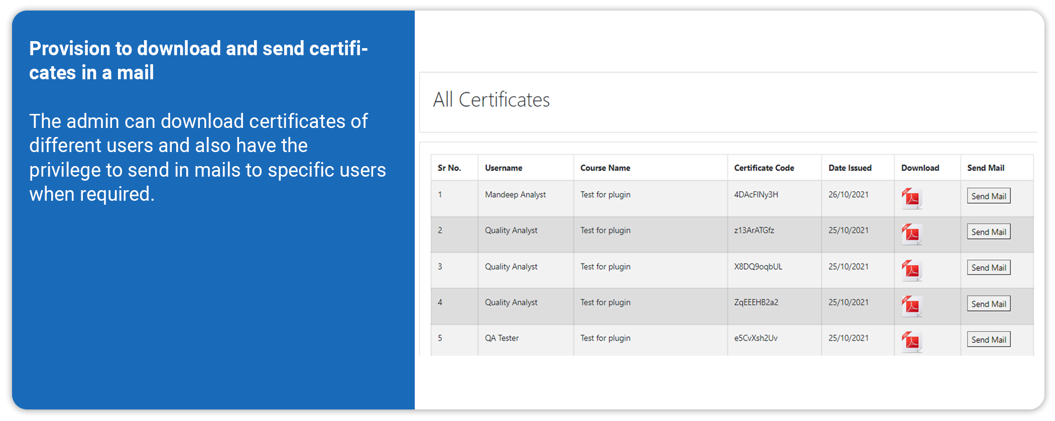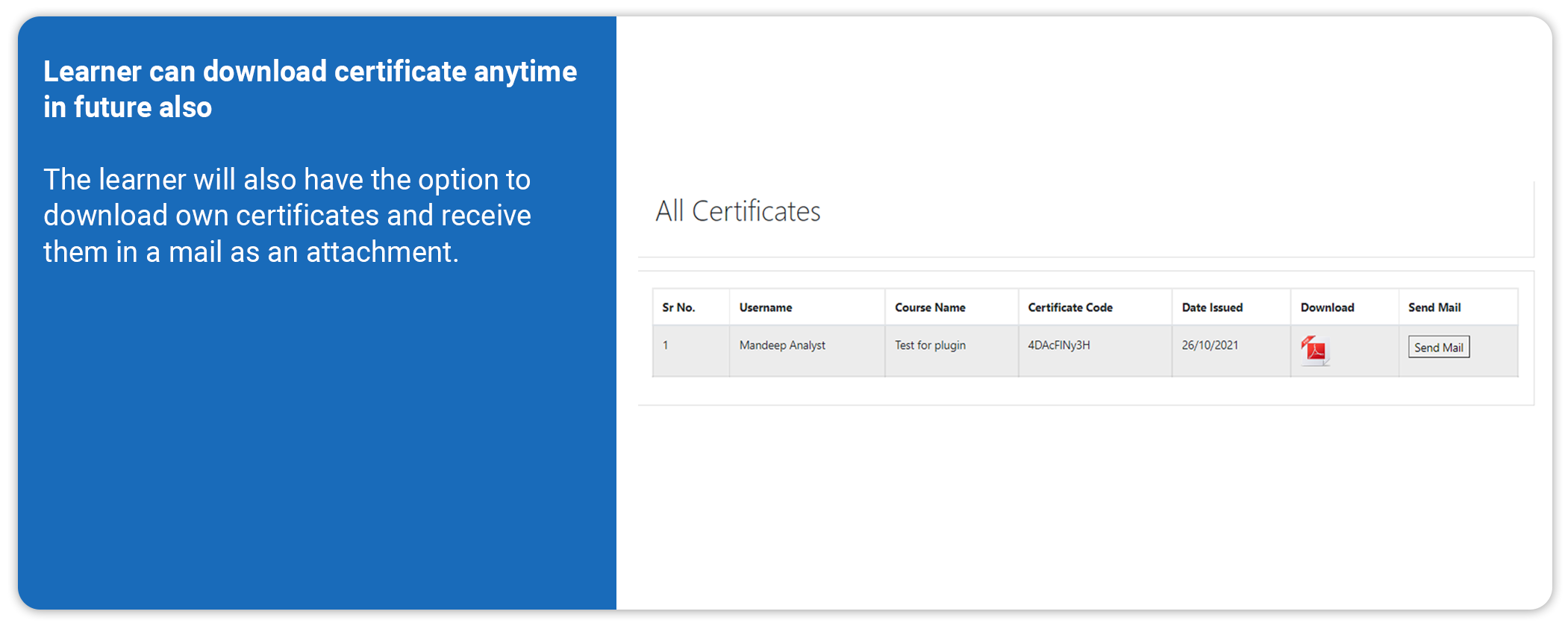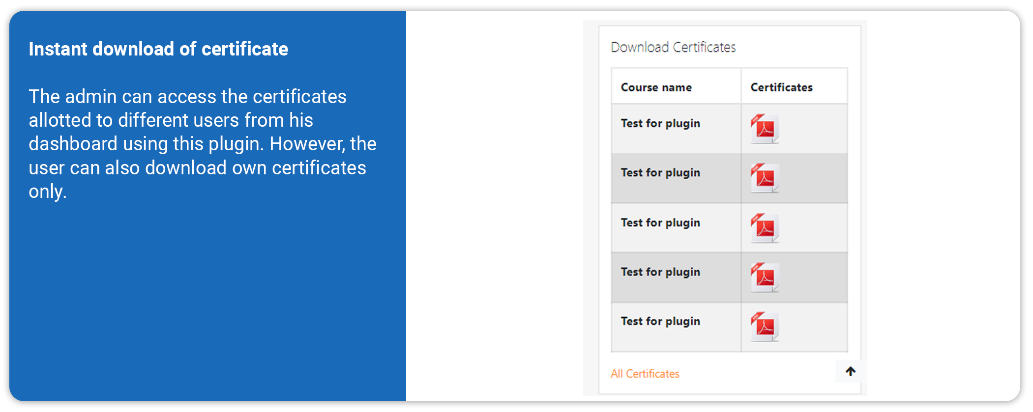 Hassling with the certificates and getting muddle up every time. Experience the “Instant certificate Download Plugin”. All your certificates will stay in right front of your eyes, you just have to reach your dashboard and you will find all your certificates. Additionally, the admin can also access the certificates of all the users. You can view your certificates, download them and even send them in a mail just in a few clicks. So, what you waiting for go grab the chance!