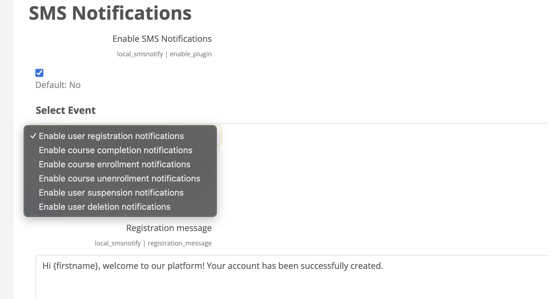 Supports Event-Based Notifications (User Registration, User Enrolment, User Unenrolment, Course Completion, User Suspension, User Deletion)