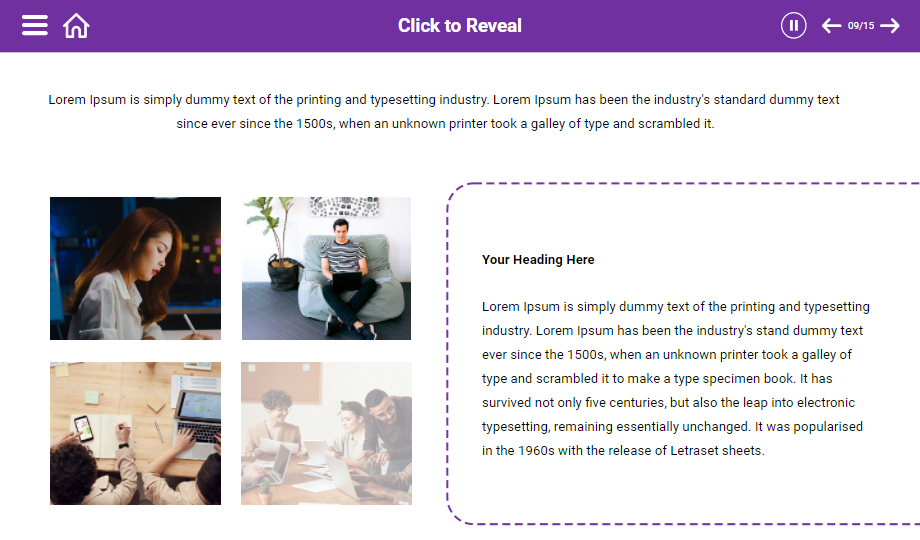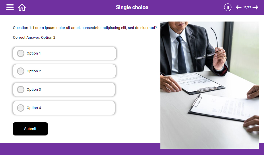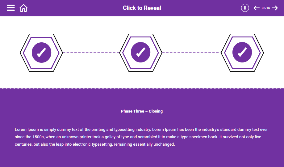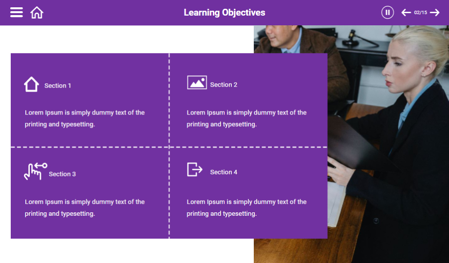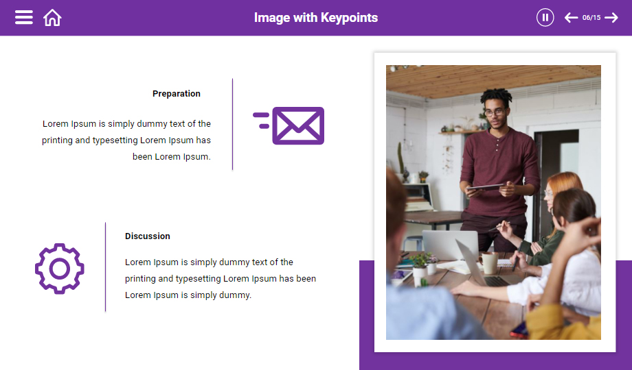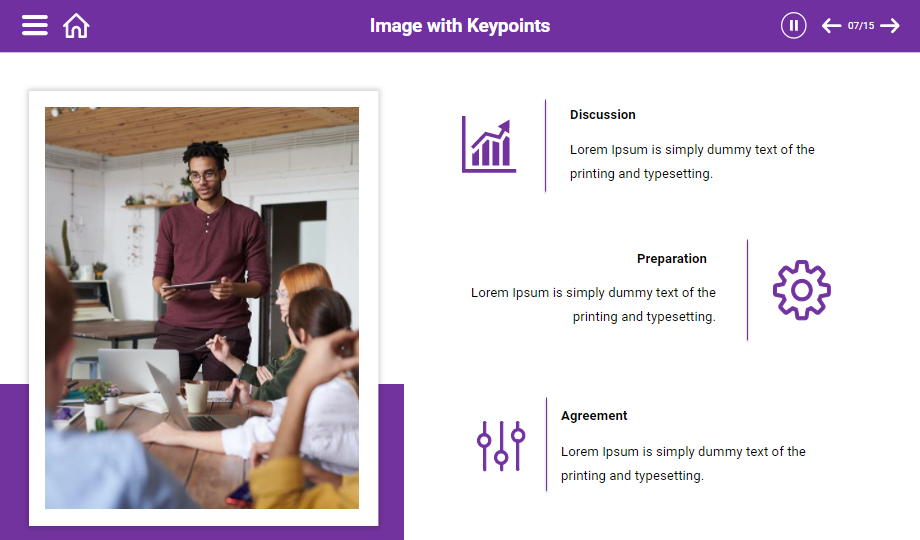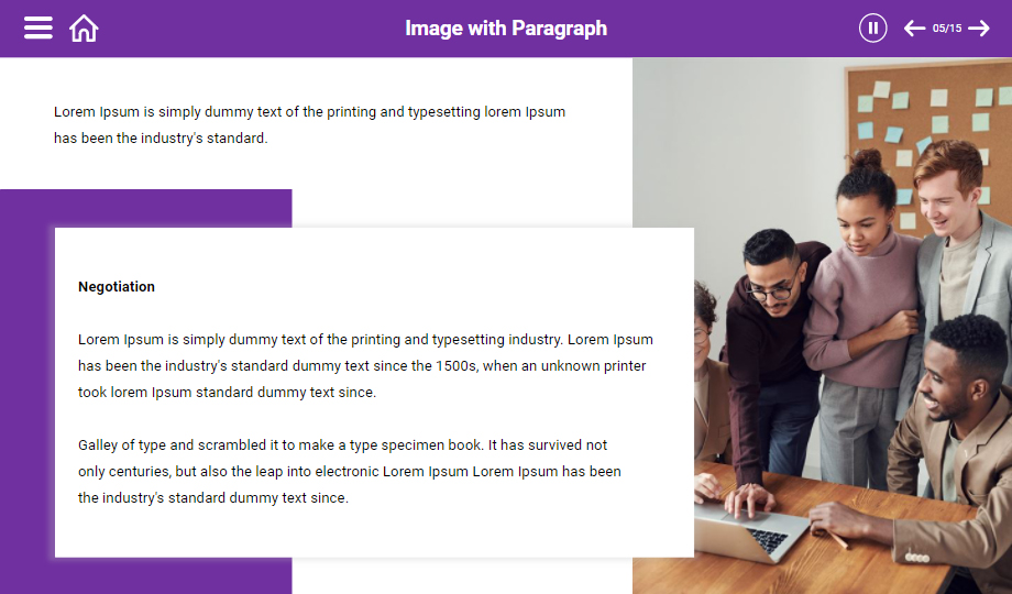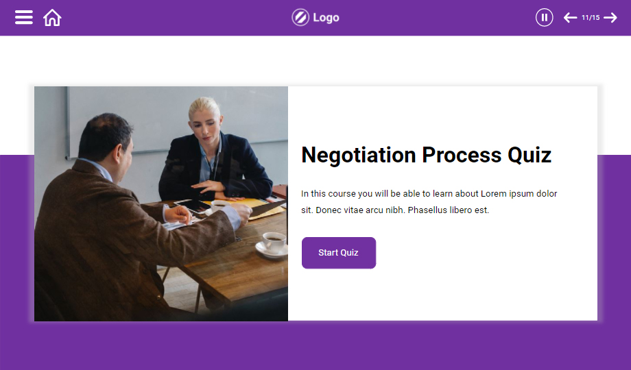 : Elevate your customers’ negotiation skills using a negotiation process e-Learning course. The course comprises slides that showcase the types of negotiation skills, process, and stages of negotiation. The course also contains quiz slides to ensure that you have understood the course entirely.