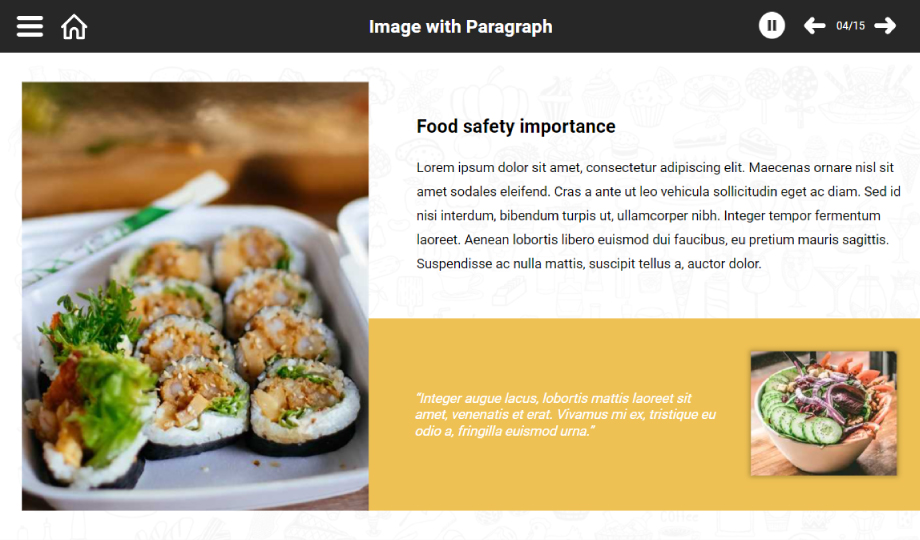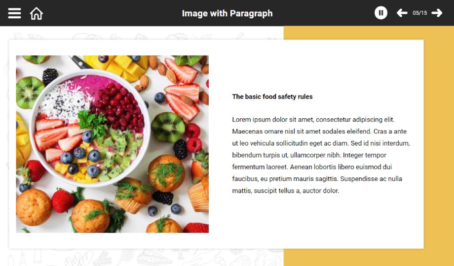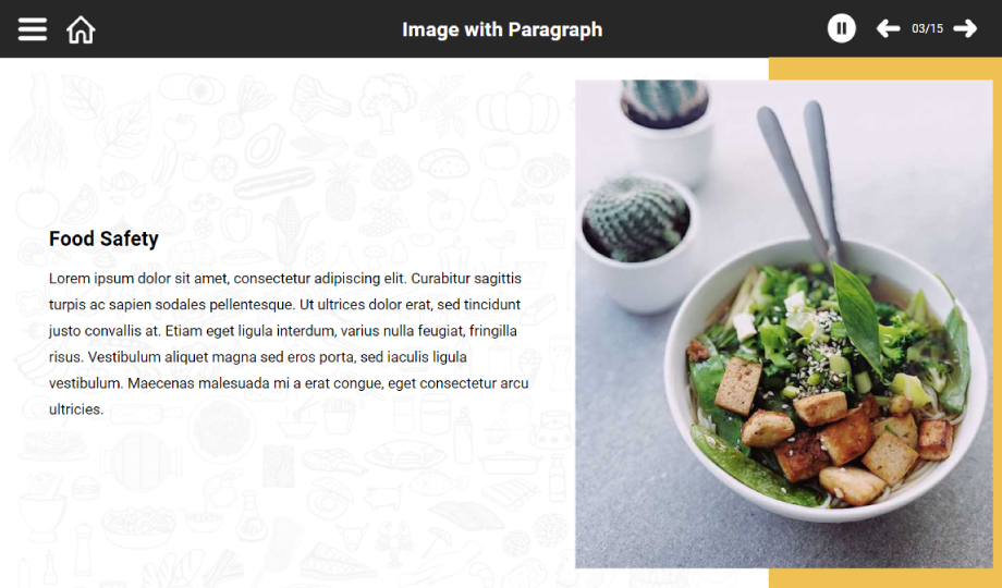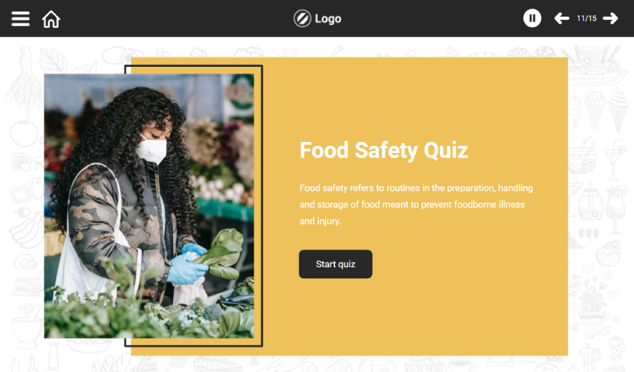 Present your employees and staff with a food safety guide with the help of a professionally designed and editable food safety e-Learning course. The course throws light on the food safety rules that need to be followed at hotels and restaurants for the customers’ safety.