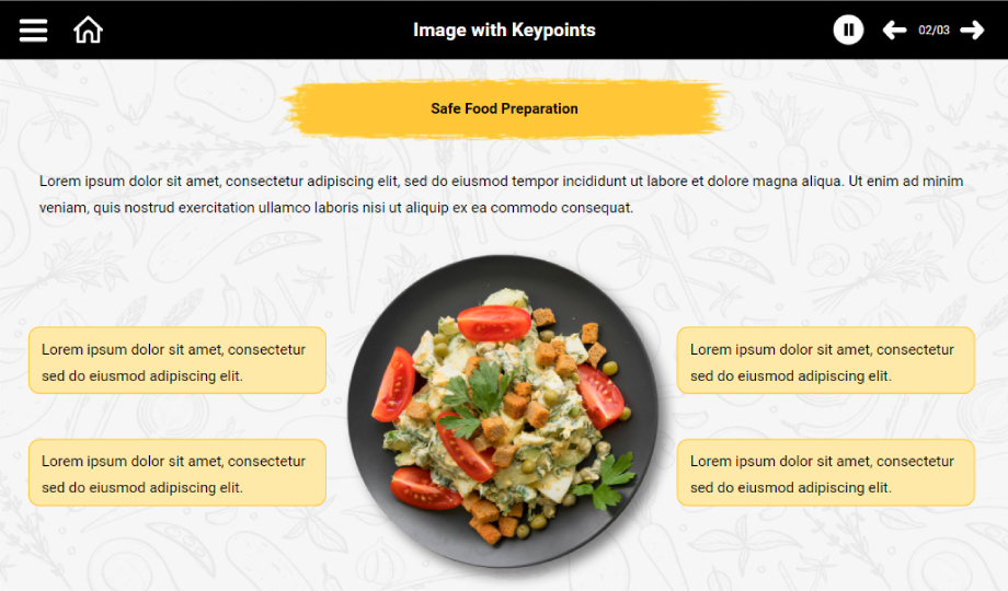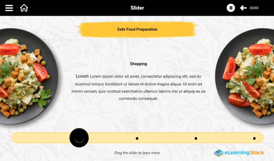 Food Preparation: Provide your audience with safe food preparation tips using a creatively designed food preparation presentation. Showcase various ways through which food can be kept secure using a ready-made food preparation course. The templates in the course are entirely customizable. You can use them to cater to your brand requirements. Download now!