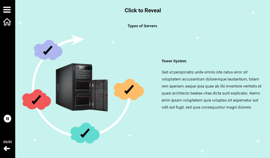 Presenting a template to explain how a server works and the different kinds of servers. This is a 3-slide interactive template designed to engage your viewer. The concluding slide comes with buttons where the user clicks the buttons to see information. The template is user friendly and easily editable. Download to own it today!