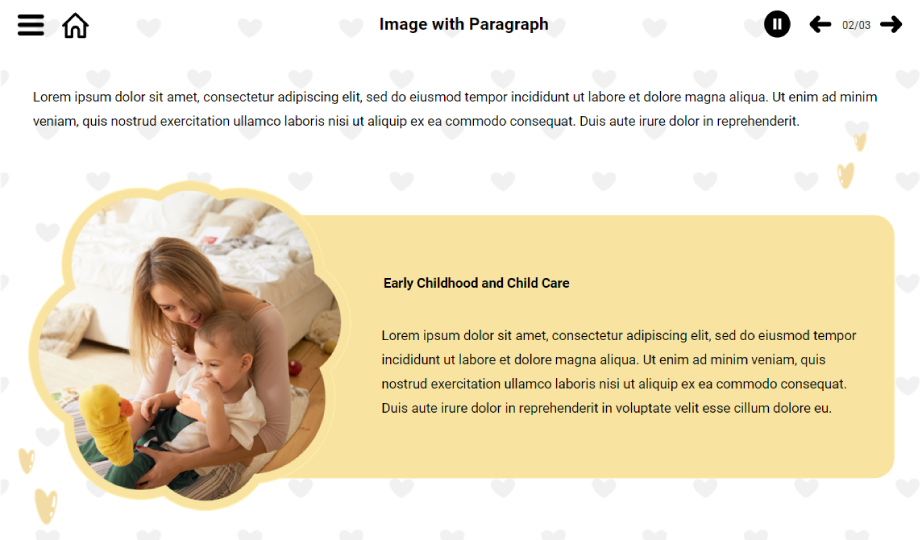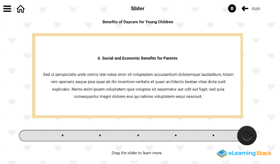 A sound child healthcare is the foundation of a strong and progressive society. If you are a professional related to child healthcare or if you are running a daycare centre for children, here are three slide templates to cover topics like – types of childcare and benefits of daycare for young children. The third slide is an interactive slide where the user has to drag the slide to see the information. Download and contribute to child healthcare today!