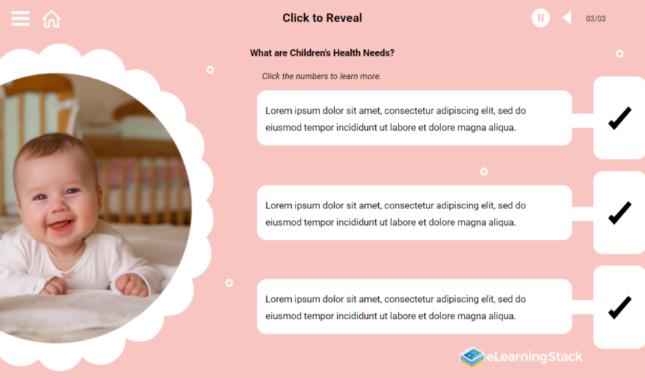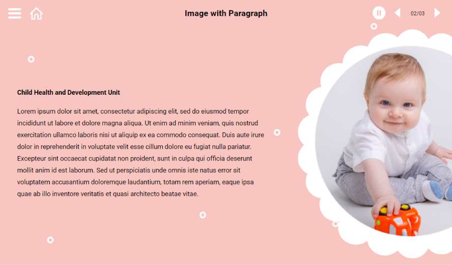 Working on spreading awareness or advertising business in childcare, here is a 3-slide template to cover topics like – child health and development unit and the health needs of children. The template is user-friendly and easily modifiable. The third slide is an interactive slide where the user has to click buttons to see the information. Each slide is filled with adorable infant pictures. Download and enchant your viewers today!