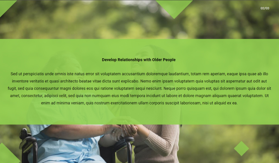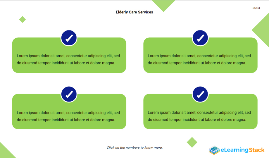 Emphasize the importance of aged care using this pre-designed course. Incorporate content in the ready-made templates that show the audience ways to help and understand older adults. Use this customizable course on old-age care and provide your audience with the options that offer old-age care services. Grab this customizable course now!