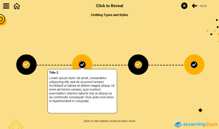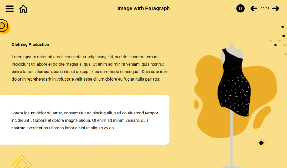 Presenting a template that explains clothing types and styles and also covers clothing production in developing countries. The last template has buttons that bring the content to life. Download this unique and dynamic template today!