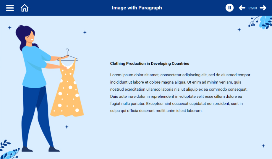 Are you working on a presentation on clothing? Are you teaching fashion design? Here is a ready-made solution for you. Presenting a template that explains clothing types and styles and also covers clothing production in developing countries. The last template has buttons that bring the content to life. The bullets present information in a captivating manner. The graphics are modern and attractive. Download this unique and dynamic template today!