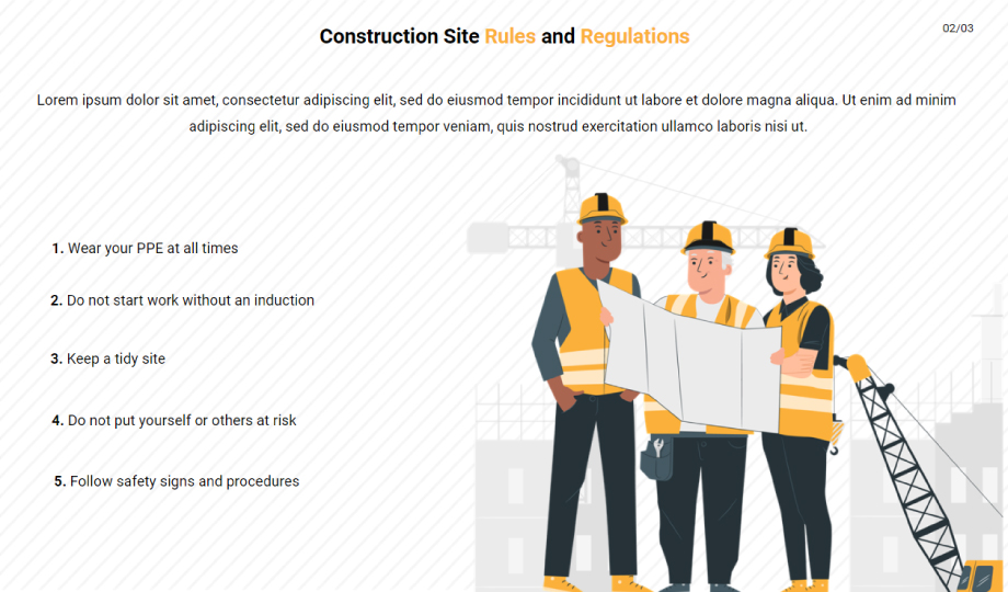 Educate your employees on the construction process that contains safety parameters, including this three-slide series template on construction. Get your hands on this innovatively designed construction e-template to head-start the training course on construction.