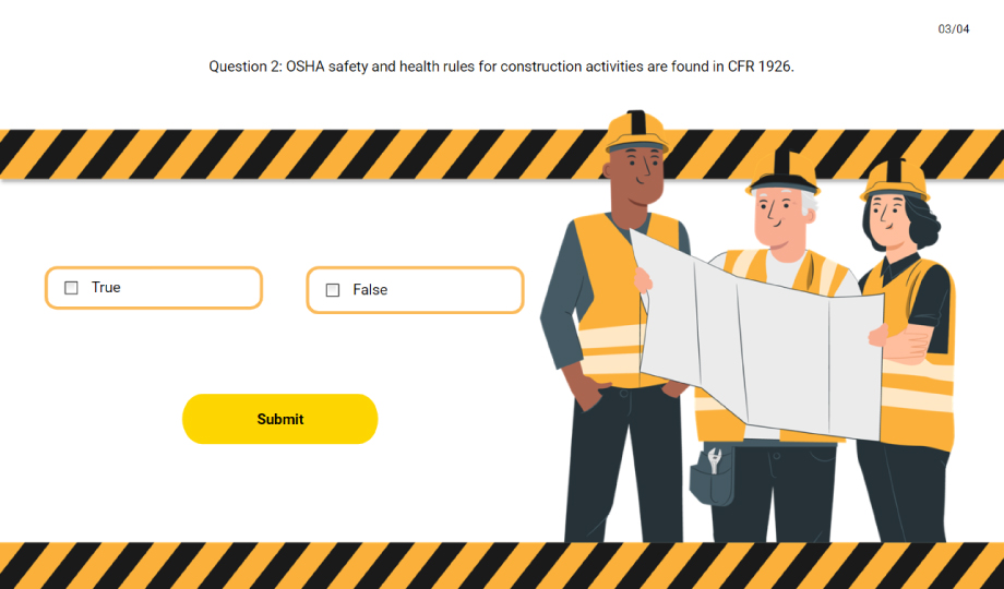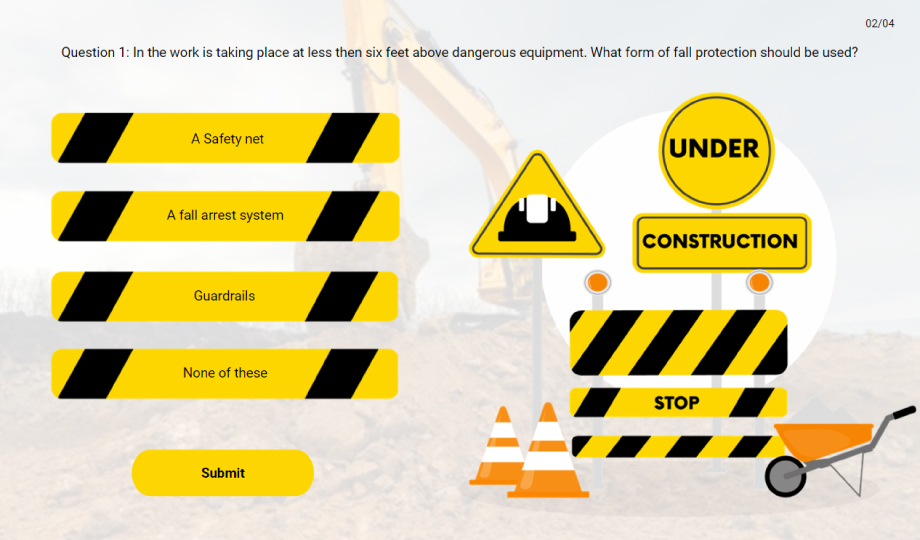 Whether you are a start-up into Construction, a contractor or a small-time business person, or even a trainer, presenting a 4-slider template for a quiz on Construction. The Construction quiz template is multipurpose, easy to use, and comprehensive. Add any kind of questions and the result slide will show the score at the end.