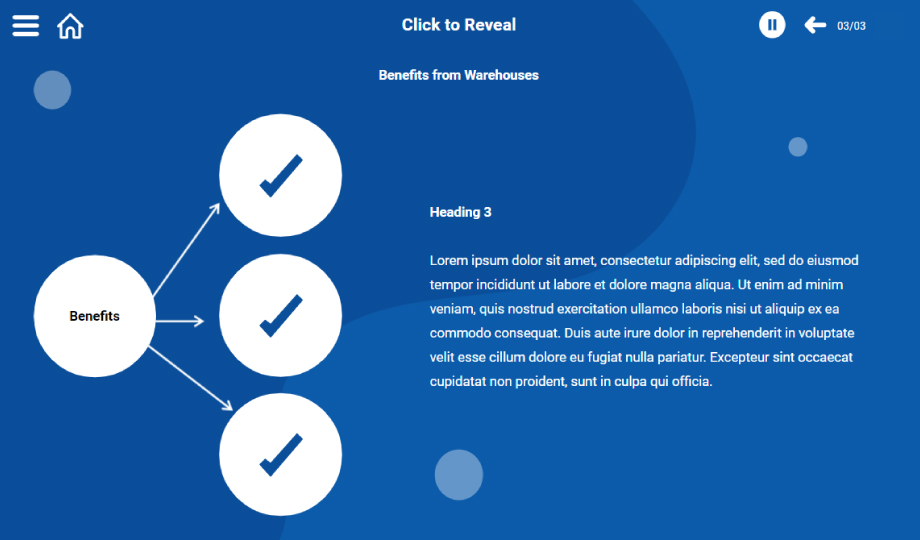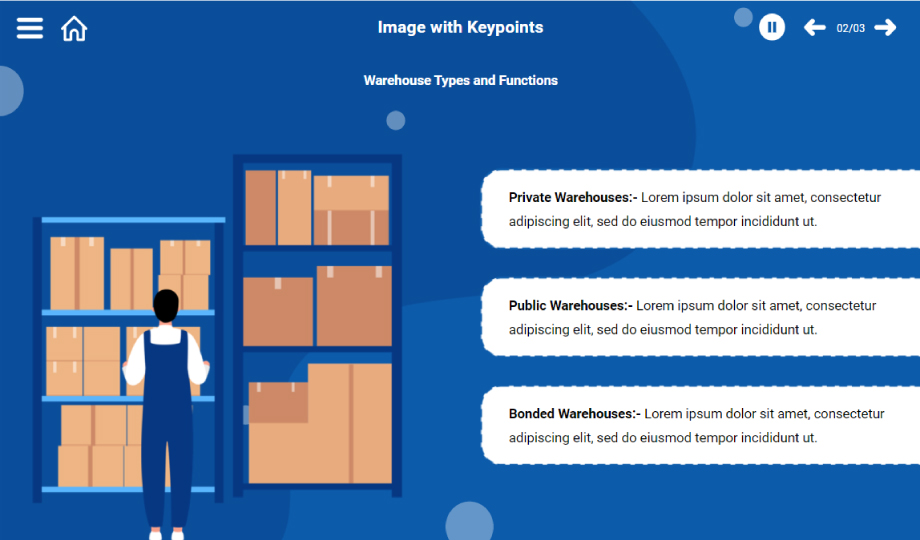 Are you an owner of a Warehouse? Are you advertising your warehouse? You can accelerate your advertising by downloading and using our 3-slide template on warehousing that explains the different types of warehouses and the benefits of warehouses. The template can be customized with ease. To bring life to content, the template has clickable buttons that make the presentation interactive. Download and engage your viewers today!