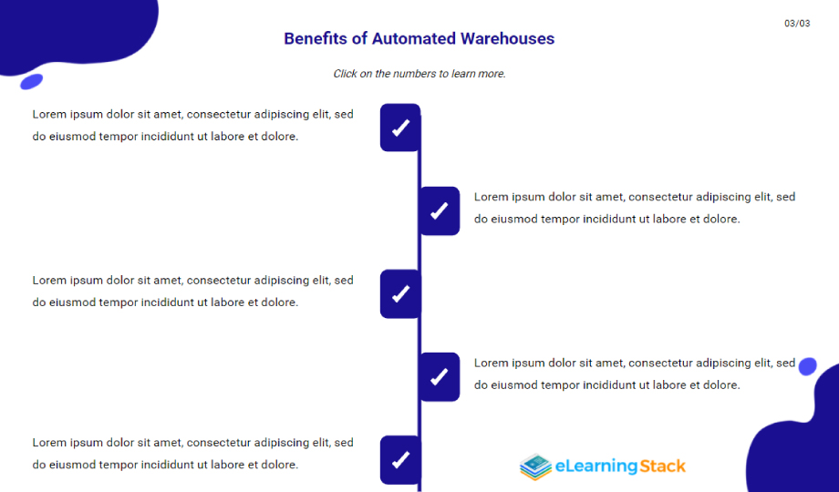 Making a presentation on Warehouse can be tough in terms of choosing the right theme and background. To ease the process, presenting a 3-slide template on warehousing. The three slides explain the different types of warehouses and the benefits of automated warehouses. The content can be edited with ease to cover the topics of your requirement. Moreover, it has clickable buttons that make the presentation interactive. Download and experience a new presentation today!