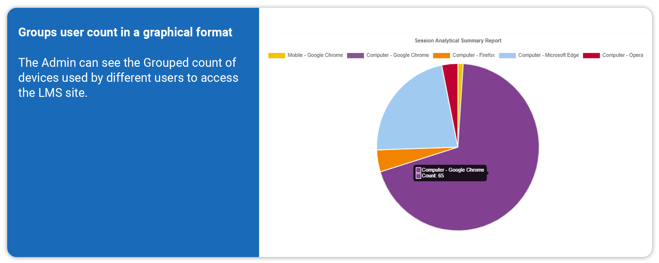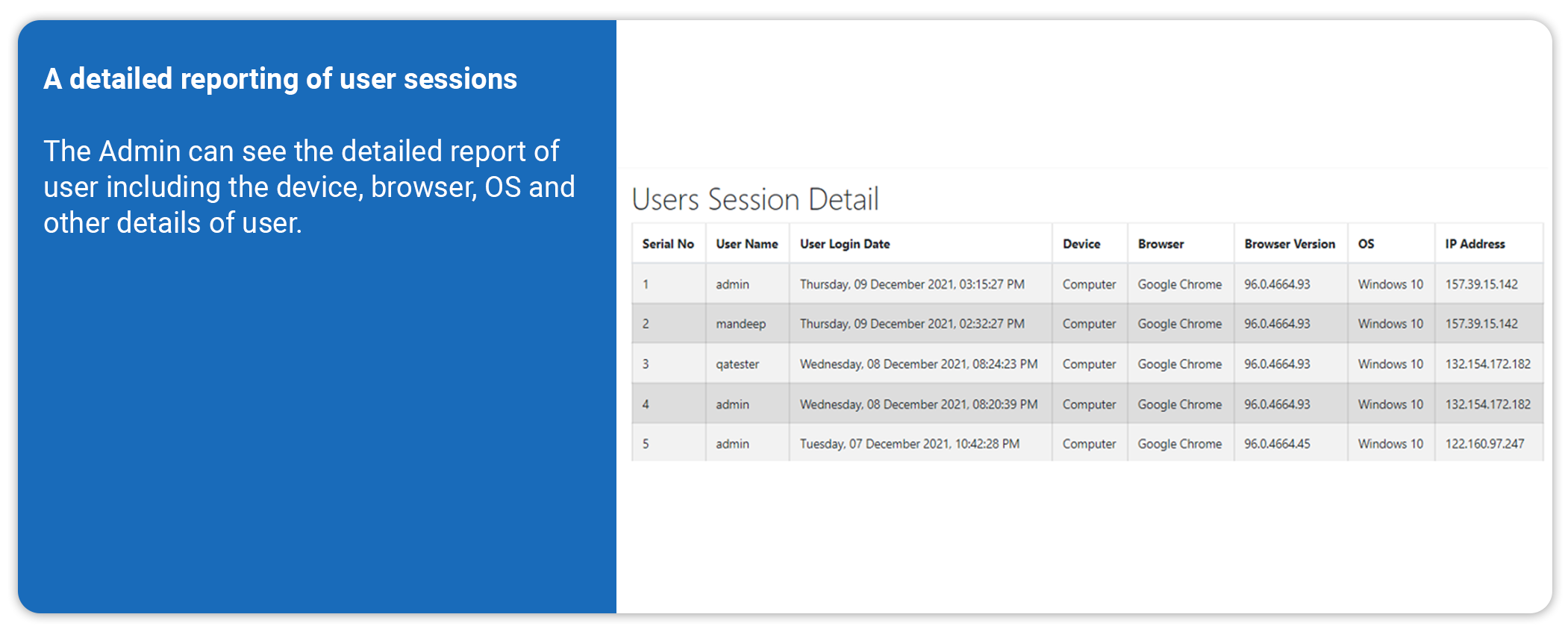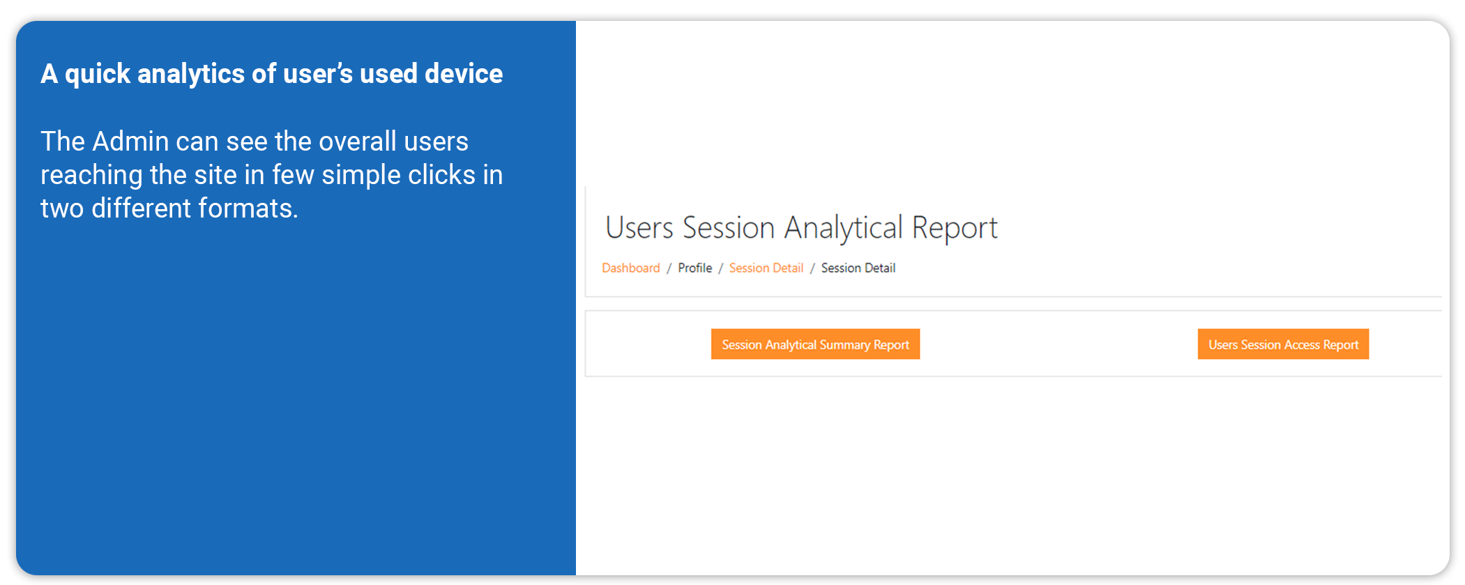 Admins can access comprehensive user session reports, including device details, browser and OS information, graphical usage trends, and multi-device group counts.